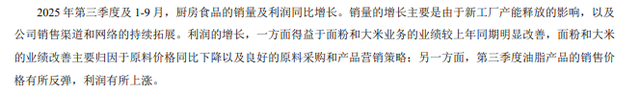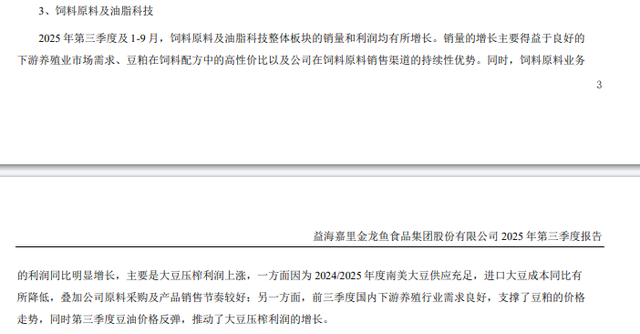 再看业绩表现,对于前三季喜增,金龙鱼表示主要是厨房食品、饲料原料及油脂科技产品的销量较上年同期均有增加,同时三季度油脂产品售价反弹等。