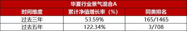 如果我们选择不同的时间维度,华夏行业景气混合的表现又如何呢?过去三年,在市场的起伏波动中,华夏行业景气混合仍然实现了53.59%的累计收益;过去五年,累计收益率更是达到122.34%,在同类基金中排名前三。