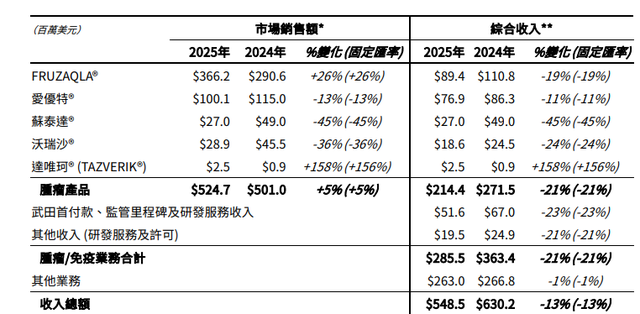 即便被视为核心支柱的呋喹替尼,中国市场销售额也同比下降13%至1.001亿美元,公司方面解释,这与监管环境调整以及集采竞品影响密切相关。
