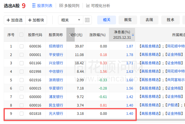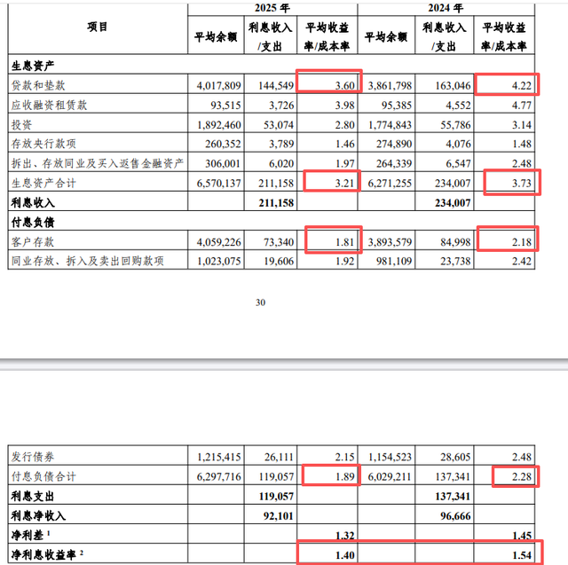众所周知,利息净收入是银行传统的存贷利差业务。近年来,受LPR下调、减费让利等政策影响,为稳住底盘各行使出浑身解数。以光大银行为例,2025年贷款收益率下降0.62个百分点至3.6%,生息资产收益率下降0.52个百分点至3.21%;客户存款付息率下降0.37个百分点至1.81%,付息负债成本率下降0.39个百分点。由于收益率滑幅高于成本率,净息差同比收窄0.14个百分点至1.4%。