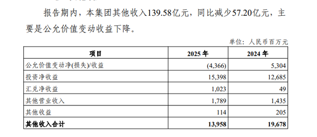 其他收入方面,由于公允价值变动收益下降,2025年同比减少57.2亿元至139.58亿元。