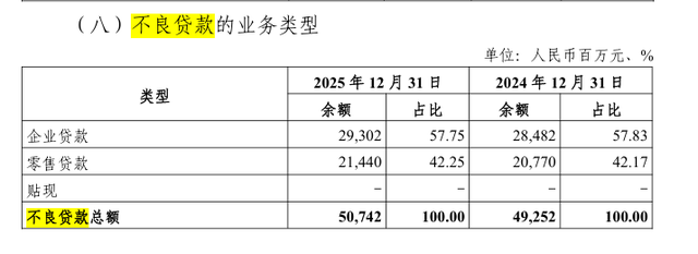 而信用减值损失的增加,通常与不良贷款余额有关。以2025年为例,当期光大银行不良贷款余额507.42亿元,同比增加14.90亿元。其中,企业与零售业务的不良余额均有增长:前者从284.82亿元增至293.02亿元,占比下降0.08个百分点至57.75%;后者则从207.7亿元增至214.4亿元,占比上升0.08个百分点至42.25%。