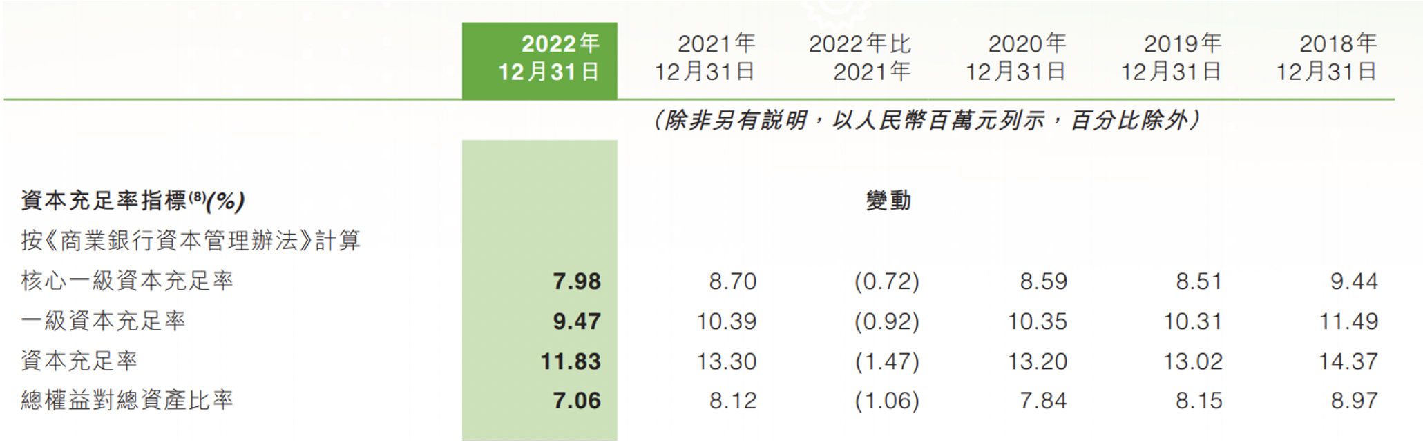 数据显示,该行2022年核心一级资本充足率、一级资本充足率、资本充足率分别为7.98%、9.47%、11.83%,均呈下降趋势。