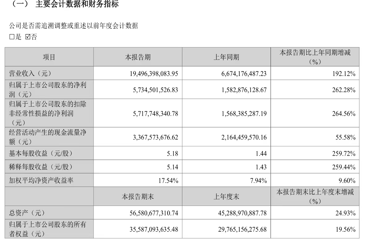 财报显示,2026年一季度公司实现营业收入194.96亿元,同比增长192.12%;归属于上市公司股东的净利润57.35亿元,同比增长262.28%,扣非净利润57.18亿元,同比增长264.6%。