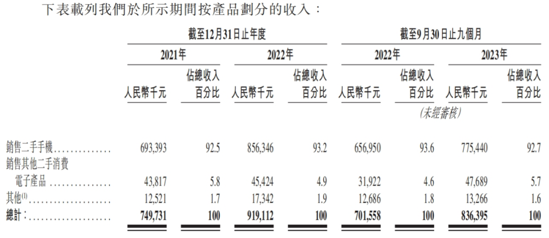 闪回科技的收入主要来源于通过公司自有平台销售二手手机业务,该部分收入营收占比超9成。此外,闪回科技还向一些线下企业提供部分二手消费电子产品,同时提供各种增值及售后服务。
