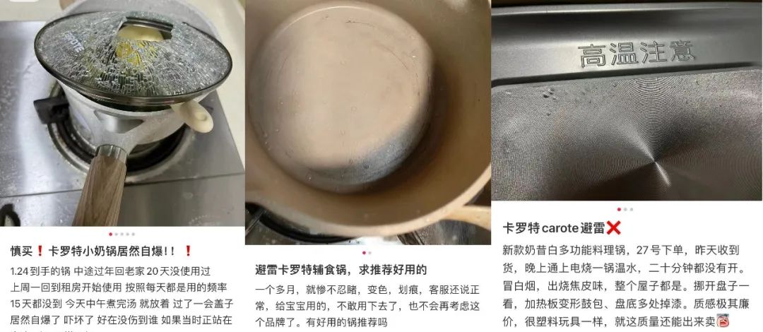 但实际情况,卡罗特的品控不甚理想,网络上有关卡罗特产品相关的“避雷贴”层出不穷,包括不粘锅糊锅、变色、有异味等产品质量问题。