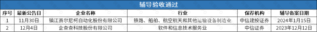 11月30日-12月6日,共2家公司境内(沪深两市)发行上市辅导验收通过。