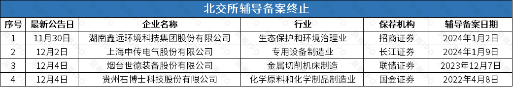 11月30日-12月6日,有4家公司北交所上市辅导备案终止。