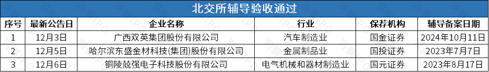 11月30日-12月6日,有3家公司北交所上市辅导备案验收通过。