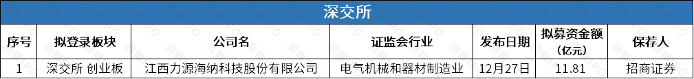 12月27日,江西力源海纳科技股份有限公司(以下简称“力源海纳”)创业板IPO获受理,保荐机构为招商证券。