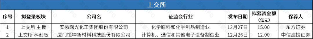 12月23日-12月29日,上交所主板有1家公司递交上市申请,科创板有1家公司递交上市申请;深交所创业板有1家公司递交上市申请。