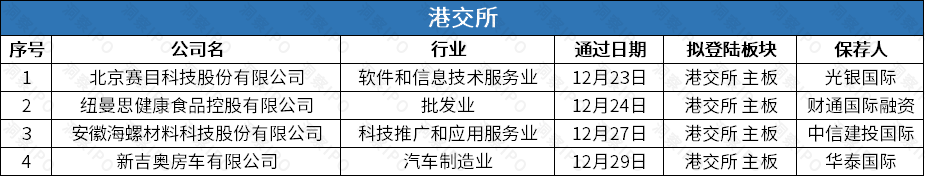 12月23日-12月29日,港交所有4家公司通过聆讯。