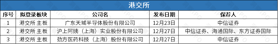 12月23日-12月29日,港交所有3家公司递交上市申请。