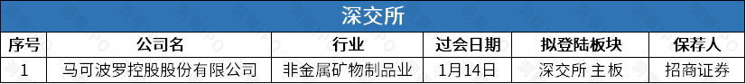 1月13日-1月19日,上交所无公司过会;深交所主板有1家公司过会。