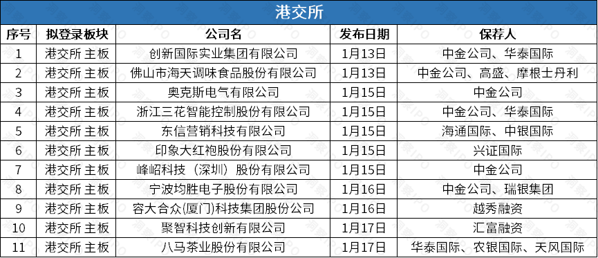 1月13日-1月19日,港交所有11家公司递交上市申请。