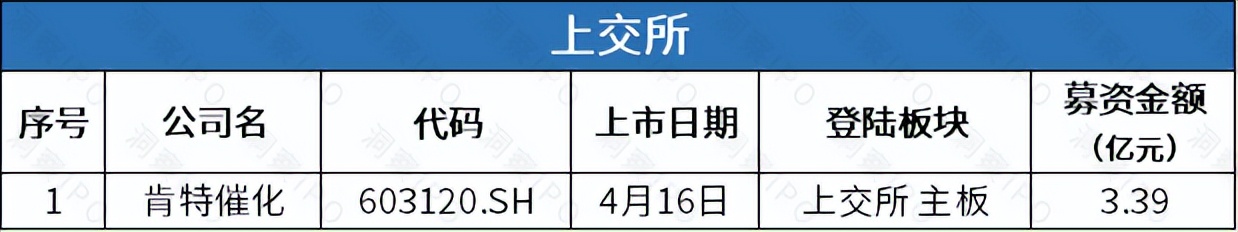 4月14日-4月20日,上交所主板有1家公司上市,深交所主板有1家公司上市,创业板有1家公司上市。