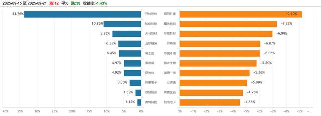 上周(9月15日-9月21日),北证50指数周跌1.43%至1578.00点。北证50成分股中,12只上涨,0只平盘,38只下跌。