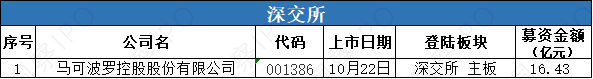10月21日-10月27日,上交所主板有1家公司上市;深交所主板有1家公司上市。