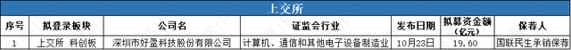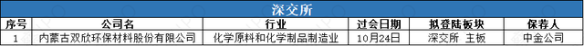 10月21日-10月27日,上交所科创板有1家公司递交上市申请;深交所无公司递交上市申请。