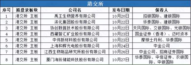 10月20日-10月27日,港交所有8家公司递交主板上市申请。