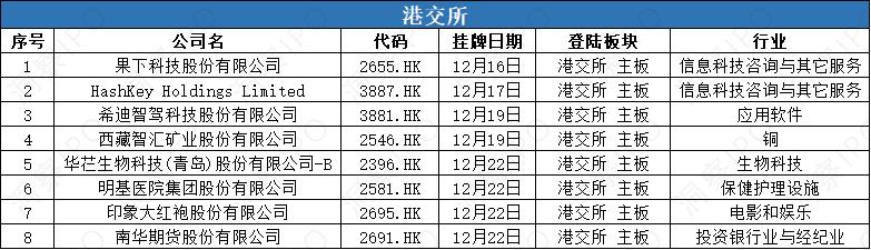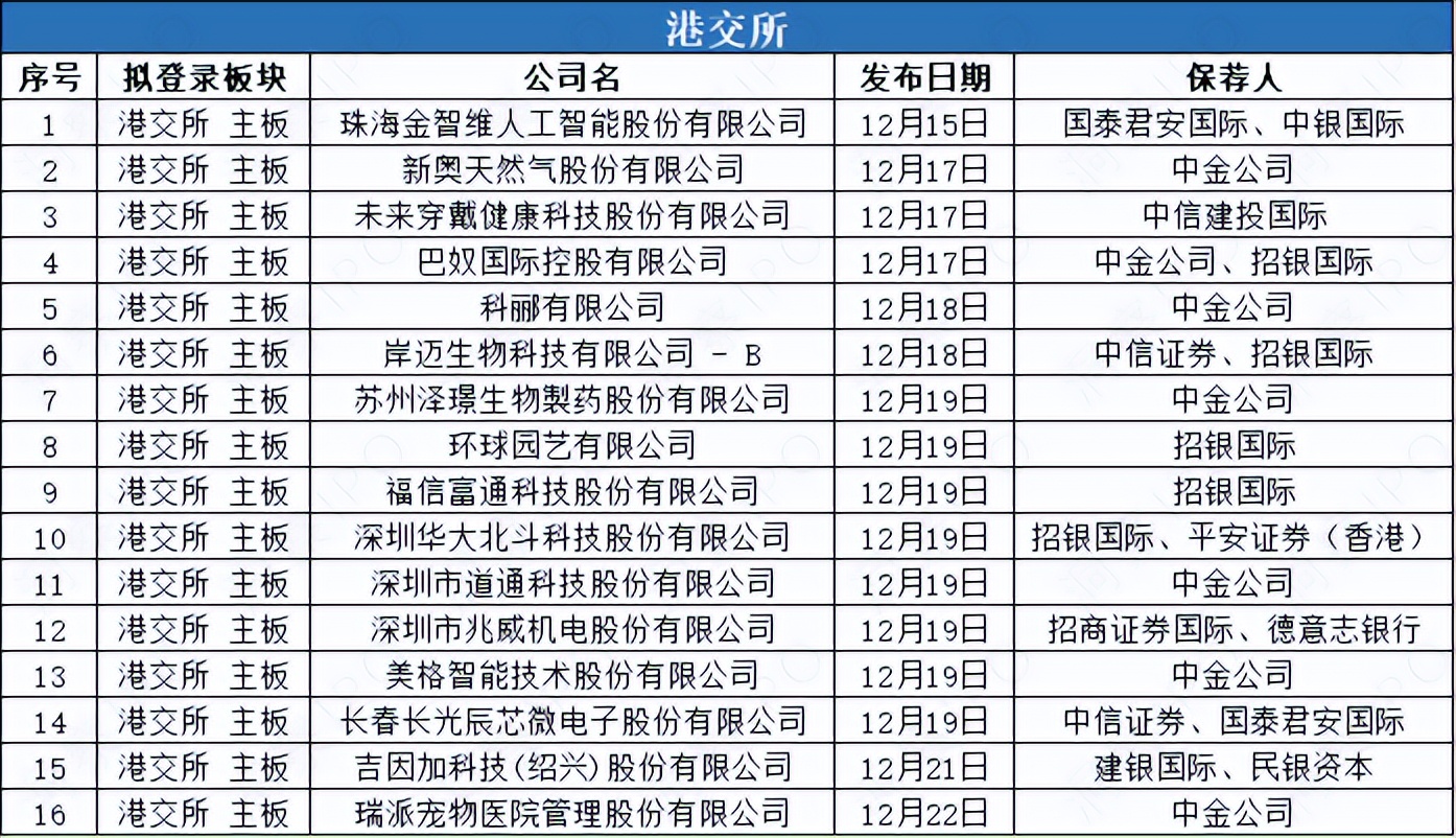 12月15日-12月22日,港交所有16家公司递交主板上市申请。
