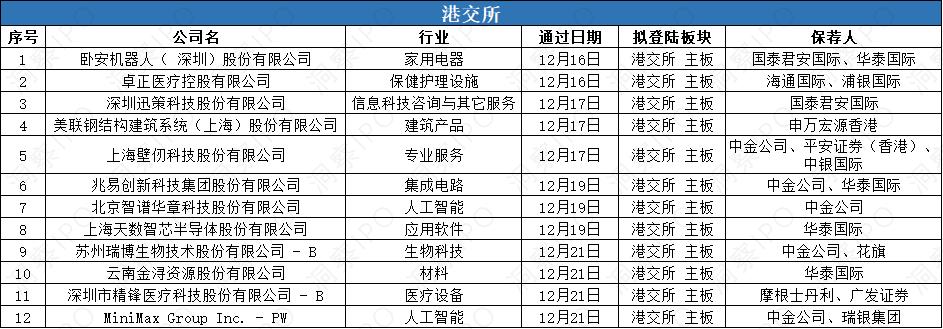 12月16日-12月22日,港交所主板有12家公司通过聆讯。