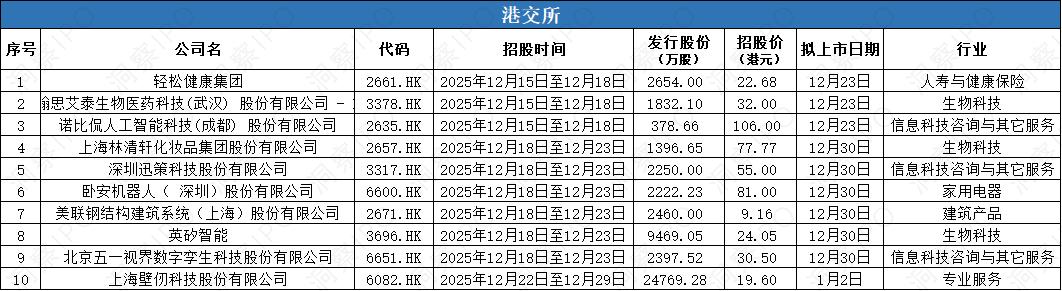12月16日-12月22日,港交所有10家公司新股招股,其中3家已完成招股。