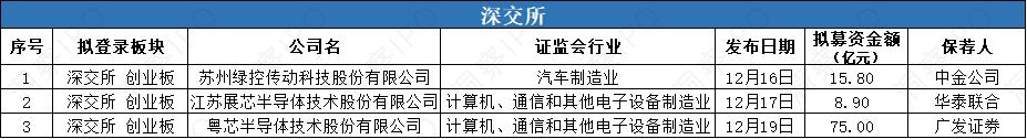 12月16日-12月22日,上交所科创板有1家公司递交上市申请;深交所创业板有3家公司递交上市申请。