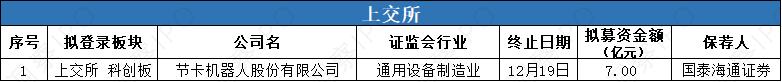 12月16日-12月22日,上交所有1家公司终止上市审核;深交所无公司终止上市审核。