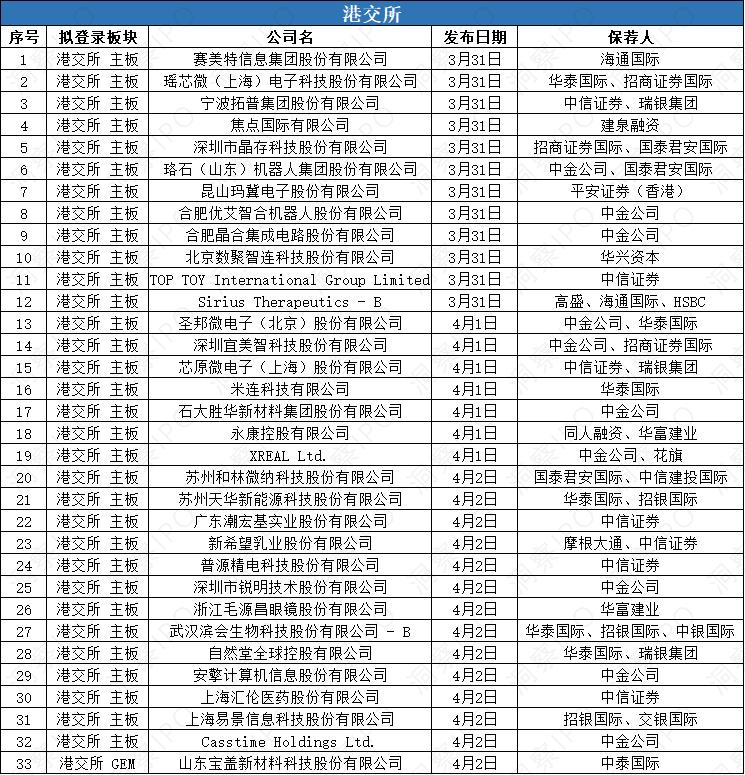 3月31日-4月7日,港交所有32家公司递交主板上市申请,1家公司递交GEM上市申请。