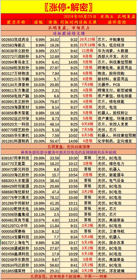 自9月24日央行推出重磅宽松政策以来,增量财政政策的发力可谓指日可待。而随着市场对10月房地产数据乐观预期的不断升温,短期市场的信心有望迎来强势回升,进而为市场提供有力支撑。加上美国降息,资金疯狂涌入股市,市场做多热情高涨,大批个股走出强势。受此影响,孔明监测到今天有云里物里、武汉蓝电、同享科技、微创光电、美之高、艾能聚、天宏锂电、沪江材料、海泰新能、旭杰科技、民士达、海希通讯、力佳科技、海达股份、大全能源、海优新材、帝尔激光、德电子、天龙集团、科源制药、必易微、西磁科技、迪尔化工、流金科技、雅本化学、纬达光电、富乐德、天合光能、安博通、金龙机电、光库科技、奔朗新材、富恒新材等75家个股最高涨10%以上。