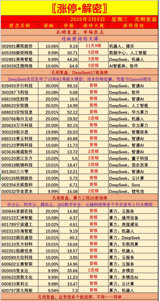 DeepSeek概念出现异动拉升。受此影响,孔明监测到今天并行科技、优刻得-W、安凯微、安恒信息、每日互动、万兴科技、拓尔思、青云科技-U、昆仑万维、软通动力、梦网科技、浙江东方、超讯通信、航锦科技、三六零、杭钢股份、天娱数科、美格智能、华金资本等个股最高涨10%以上。