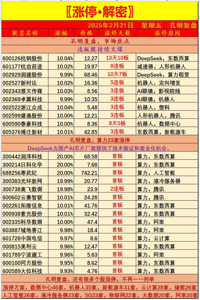 成交量持续过万亿元,市场人气高涨,增量资金跑步进场,A股延续活跃态势,个股频频刷新高。受此影响,孔明监测到今天有科泰电源、江苏雷利、华丰科技、双飞集团、金杨股份、亿田智能、奥飞数据、峰岹科技、和林微纳、川环科技、隆扬电子、弘信电子、盛弘股份、宏景科技、科思科技、通合科技、申昊科技、趣睡科技、儒竞科技、三丰智能、致尚科技、盈峰环境、英威腾、浙江众成、海南华铁、中鼎股份、杭齿前进、信质集团、长源东谷、新时达、冰轮环境、云赛智联、博迁新材等48家个股最高涨10%以上。