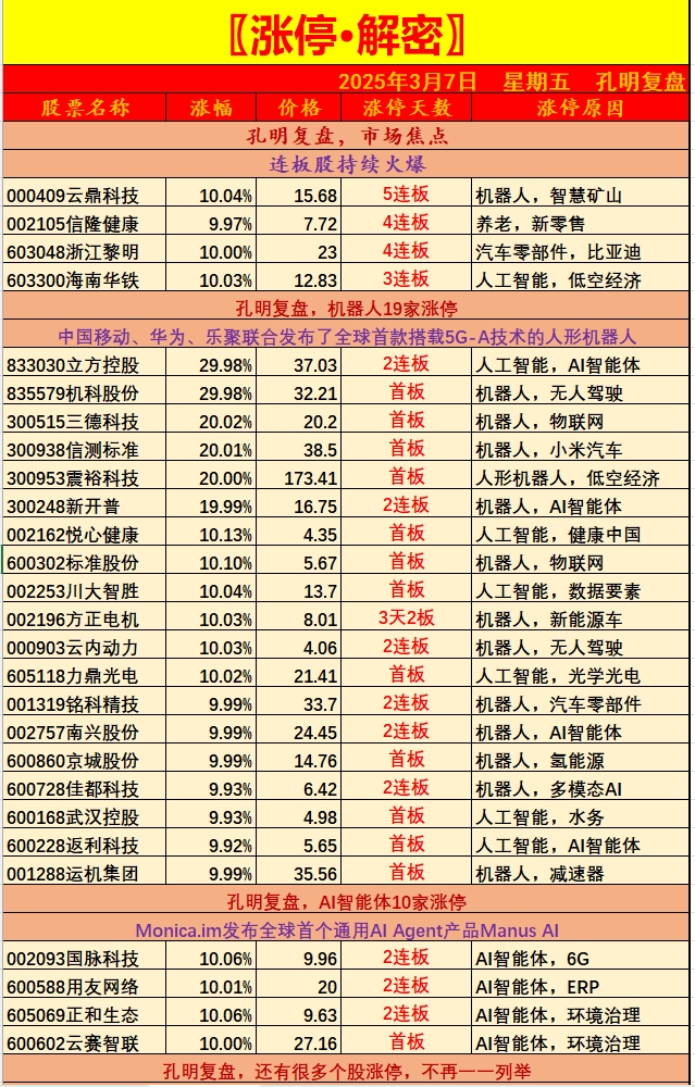 2025年人形机器人量产可期,预计2025年产值将翻倍至53亿元。人工智能板块出现异动拉升。受此影响,孔明监测到今天立方控股、新开普、天山电子、迈信林、鸿泉物联、信息发展、悦心健康、川大智胜、云鼎科技、海南华铁、力鼎光电、用友网络、南兴股份、武汉控股、佳都科技、返利科技、均普智能、集智股份等个股最高涨10%以上。