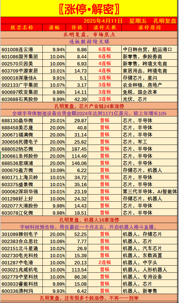 全球半导体制造设备出货金额2024年达到1171亿美元,较上年增长10%。芯片板块出现涨停潮,孔明监测到今天晶华微、唯捷创芯、美芯晟、富满微、民德电子、纳芯微、圣邦股份、思瑞浦、华虹公司、杰华特、龙迅股份、晶丰明源、*ST农尚、利尔达、华峰测控、卓胜微、长光华芯、炬芯科技、华岭股份、安路科技、锴威特、慧智微-U、艾为电子、必易微、创耀科技、峰岹科技、南芯科技、明微电子、芯海科技、翱捷科技-U、帝奥微、力源信息、芯朋微等48家个股最高涨10%以上。