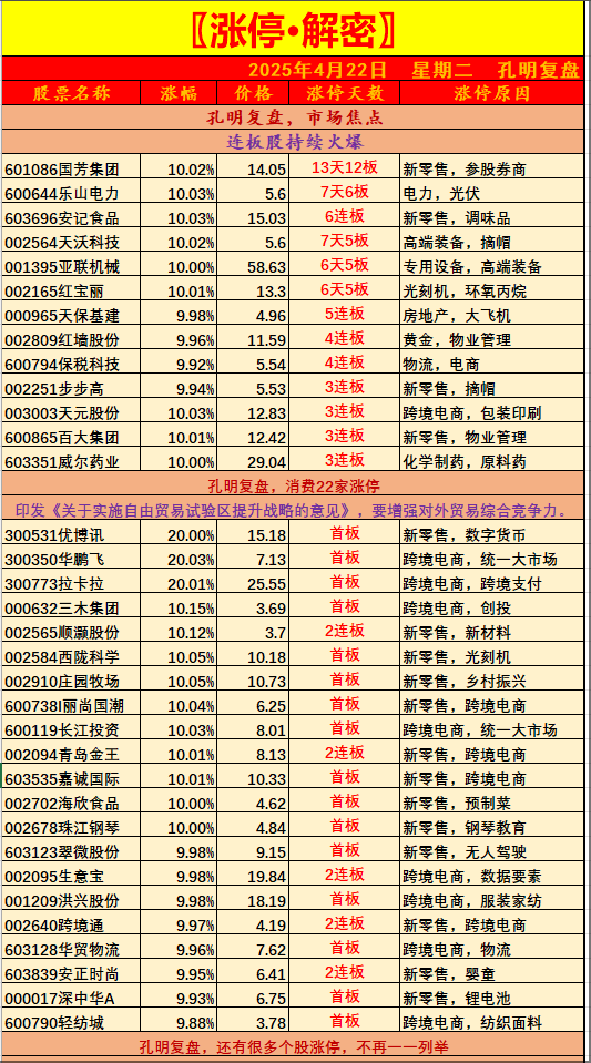 促进养老、生育、文化、旅游等,扩大有效投资,大力提振民间投资积极性。新零售板块出现异动拉升。孔明监测到今天优博讯、顺灏股份、西陇科学、庄园牧场、丽尚国潮、安记食品、国芳集团、青岛金王、嘉诚国际、百大集团、海欣食品、翠微股份、跨境通、安正时尚、步步高、深中华A等个股最高涨10%以上。