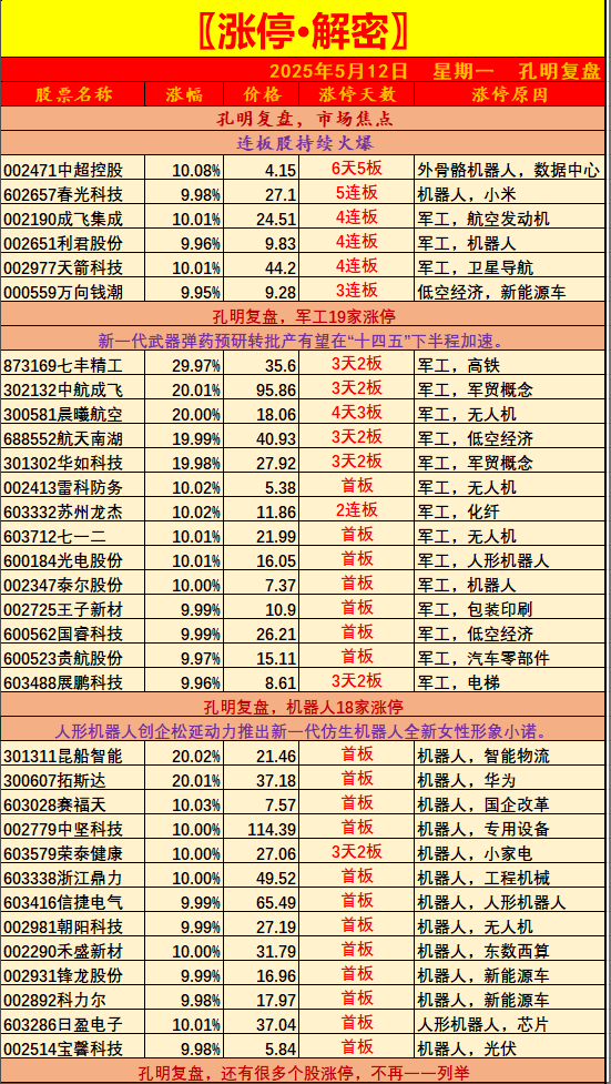周一,A股三大指数震荡走高,创业板涨逾2%,深成指涨逾1%。盘面上,航天航空、船舶制造领涨,电机、通信设备、消费电子、电池、交运设备、光伏设备、电子元件、小金属、汽车零部件、互联网服务、工程机械等涨幅居前,贵金属、生物制品、电力、农牧饲渔等小幅回调。截止收盘,沪指涨0.82%,深证成指涨1.72%,创业板指涨2.63%。沪深两市成交额超过1.3万亿,较上个交易日放量逾千亿。两市共有85只个股涨停或(创业板、科创板、北交所个股涨10%以上);中线跟踪的个股,持续纷纷轮番表现,孔明监测今天最活跃的个股有航天南湖、晨曦航空、康平科技、中超控股、红墙股份、天箭科技、成飞集成、禾盛新材、春光科技、宝馨科技、华阳新材、利君股份、万向钱潮、兆丰股份、华伍股份、神州高铁、中洲特材、跨境通、明新旭腾、新坐标、大叶股份、久其股份、渝三峡A、爱乐达、迪生力、生意宝等。