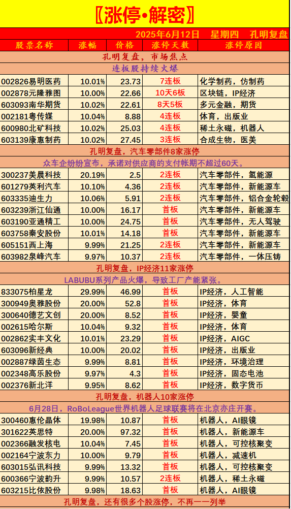 婴童概念出现异动拉升。受此影响,孔明监测到今天青木科技、奥雅股份、德艺文创、新莱福、哈尔斯、康惠制药、实丰文化、若羽臣、元隆雅图、诺邦股份、高乐股份、仟源医药等个股最高涨10%以上。