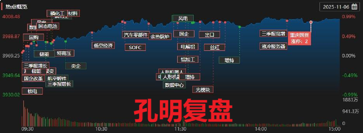热点上,电网设备活跃,摩恩电气、新能泰山、摩恩电气、保变电气、正泰电器、太阳电缆、中国西电、保变电气涨停。存储芯片冲高,香农芯创创新高,盈新发展涨停,太极实业、德明利、江波龙、普冉股份、壹石通跟涨。磷化工走强,清水源20cm涨停,澄星股份、芭田股份、六国化工涨停,云天化、川恒股份、兴发集团、川金诺涨逾6%。人形机器人概念走强,方正电机、五洲新春、万向钱潮涨停,东山精密、绿的谐波、麦迪科技涨幅居前。