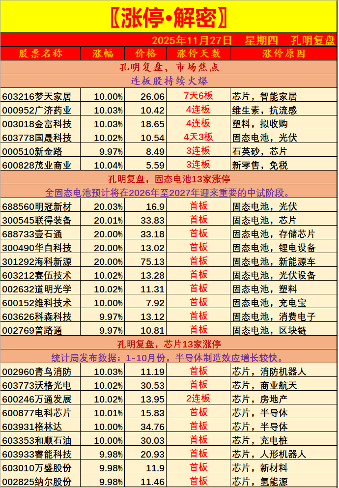 周四,A股冲高回落,沪指小幅上涨。盘面上,造纸印刷、电池、消费电子、光伏设备、化学原料、电子化学品、美容护理、半导体、光学光电子涨幅居前,文化传媒、互联网服务、医药商业、水泥建材、游戏、教育、工程机械等跌幅居前。截止收盘,沪指涨0.29%,深证成指跌0.25%,创业板指跌0.44%。沪深两市成交额超过1.7万亿,较昨日缩量近千亿。两市共有68只个股涨停或(创业板、科创板、北交所个股涨10%以上);中线跟踪的个股,持续纷纷轮番表现,孔明监测今天最活跃的个股有海科新源、茂业商业、广济药业、金富科技、国晟科技、石大胜华、特一药业、新金路、梦天家居、智动力、东岳硅材、合富中国。
