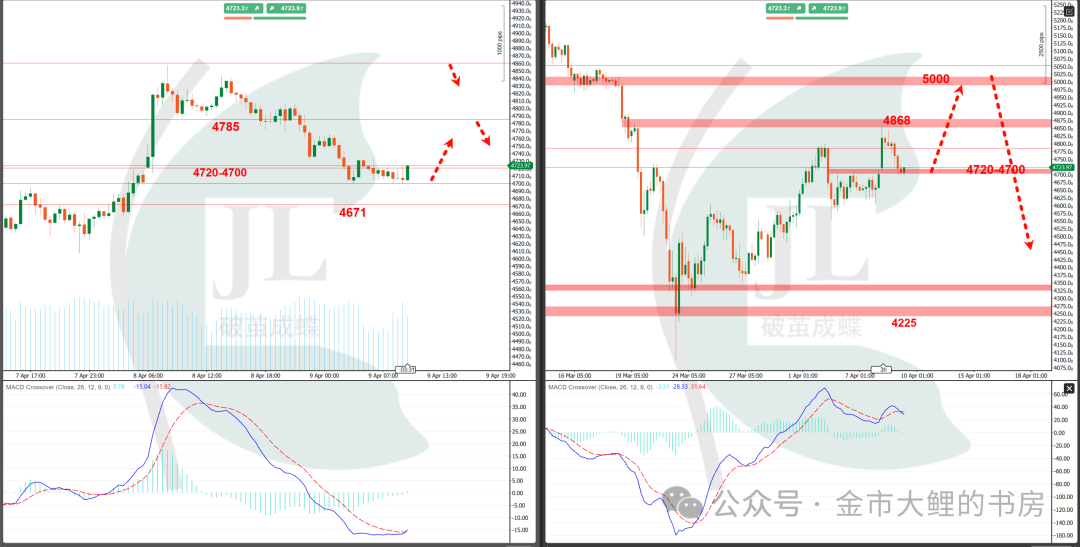 包括昨天金价也创了阶段性高点,比清明节前的高点还高。所以说,从4700这个点位来看,下一个波段有望冲击到5000的走势。不过有一点需要担忧,就是4小时级别MACD,昨天的下跌已经形成了死叉,出现了顶背离的迹象。
