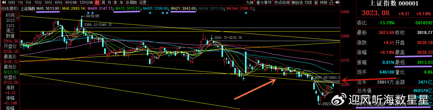 在上周五收评的标题《无惧外围利空大盘低开高走收复3000点,下周关注多体系共振压力位》里,听海很明确地指出了“下周关注多体系共振压力位”,这个多体系共振强压力位,也就是上面日K线图中,红色箭头所指之处。考虑到会有新来的朋友,今天就再次列举一下在此形成共振的多个体系的要素: