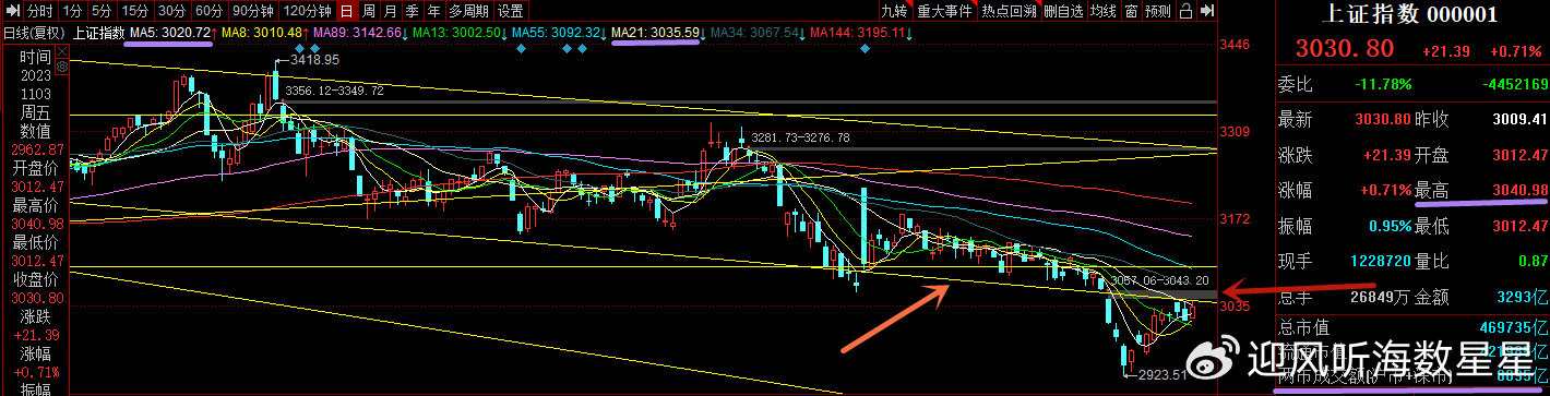 上图为大盘截至本周五收盘时的日K线图。本文上下文中所提及的两条均线收盘时所处的点位已划线标注。可以看到,大盘从本周三至本周五,是连续三个交易日触及了上图中,红色箭头所指向的这个多体系共振强压力位,而且量能的表现也直接决定了大盘短线的强弱。大盘这个多体系共振强压力位,是由以下多个体系的要素形成共振: