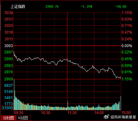 周三早盘,A股三大指数全线小幅低开,沪市大盘和深成指都是低开0.20%,创业板指低开0.24%。开盘后三大指数都持续大幅震荡低走,沪市大盘和深成指都是开盘点位成为了日内最高点(分别为2997.34点和9606.48点),而收盘点位又都成为了这两者的日内最低点(分别为2968.76点和9476.62点),创业板指也是开盘点位和日内最高点,以及收盘点位和日内最低点之间,差距都不足一个点,三大指数全线收取跌幅超过1%的光头光脚大阴线。截至收盘,大盘大跌1.15%,深成指大跌1.54%,创业板指大跌1.66%。