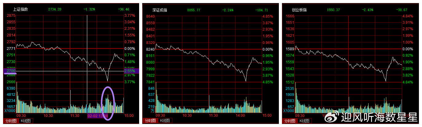 上图为A股三大指数本周五的分时图。其中大盘的分时图听海是把鼠标放在了整数关口2700点处,紫色圈圈标注的超大幅放量下面章节再细说。