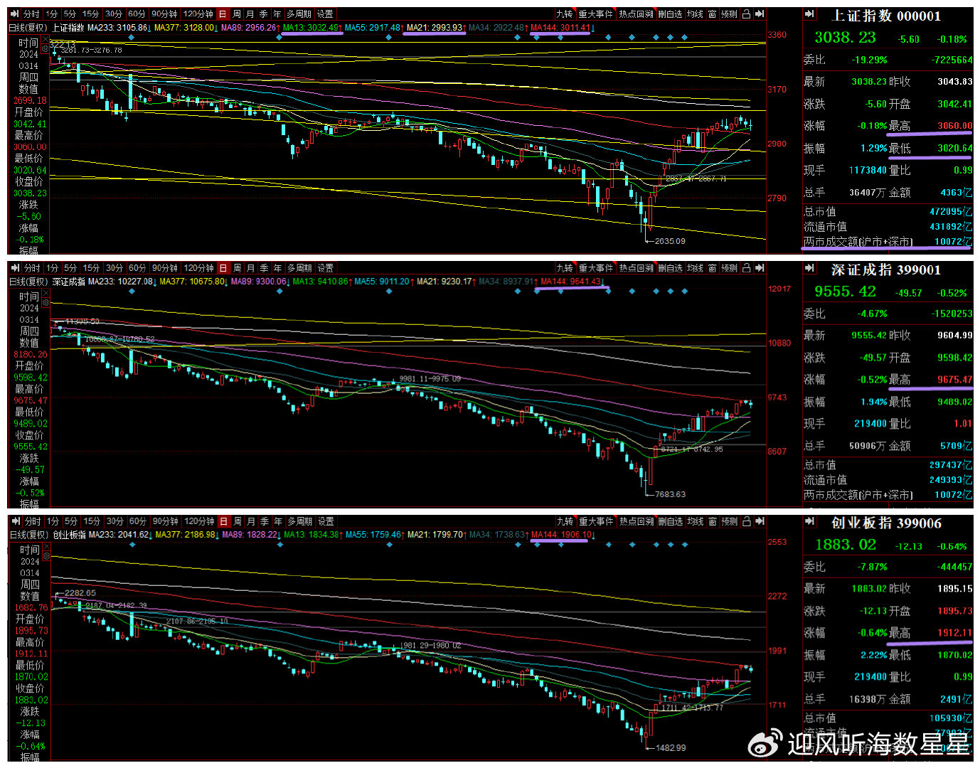 至于深市两大指数本周四的日内高点,也正是此前三天收评里,听海也是重要的话说了三遍的,这两者的中线生死线144日均线,以及深成指2023年12月5号的缺口(它在本周三已经封闭上了)。