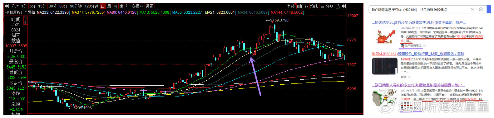 上图左侧为中证全指半导体(H30184) 指数2021年2月起的日K线图,右侧为搜索到的当时听海的相关笔记。