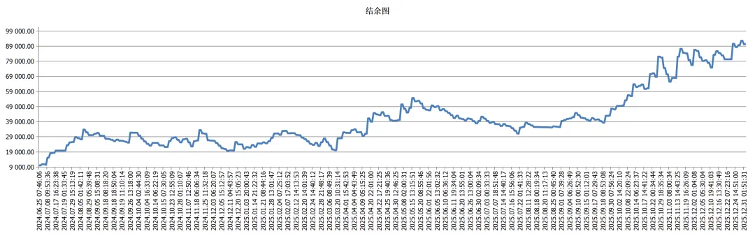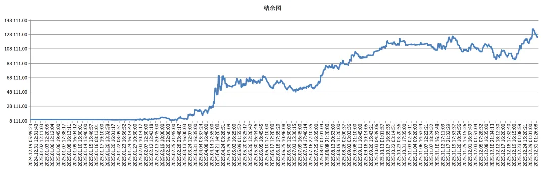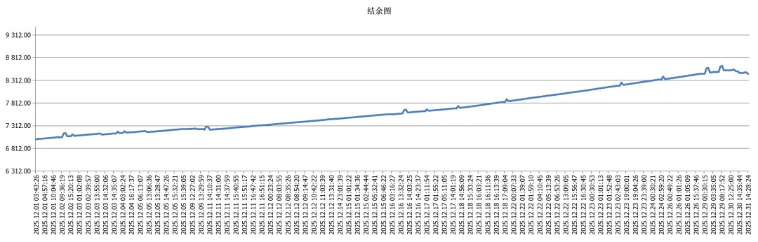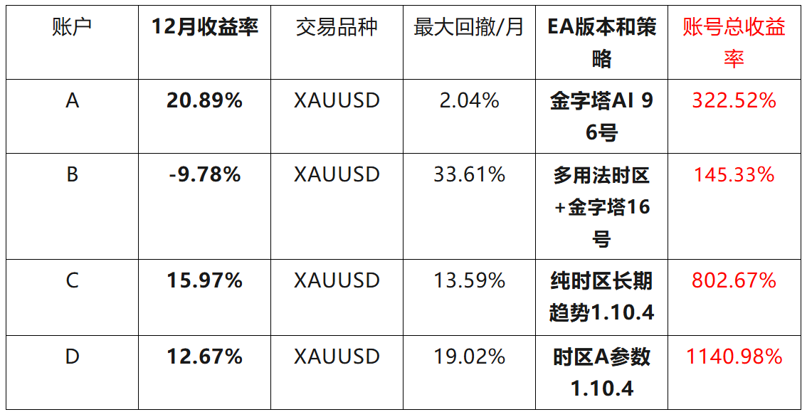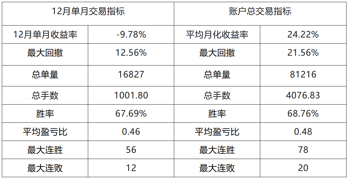 该账户在12月份同时使用了时区1.10.4版本和金字塔AI两个系统,总单量超过了1万单。从资金曲线上来看上下地进行震荡,这对于持仓心态来讲是一种挑战。