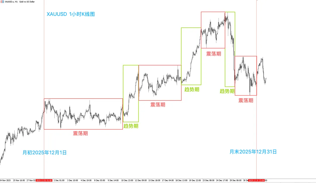 本部分内容主要分析黄金品种。下图是2025年12月份黄金(XAUUSD)的1小时K线图,从图中可以看到黄金在本月进行了震荡行情和趋势行情的轮替,且趋势期的时间相比于震荡期的时间明显更短。