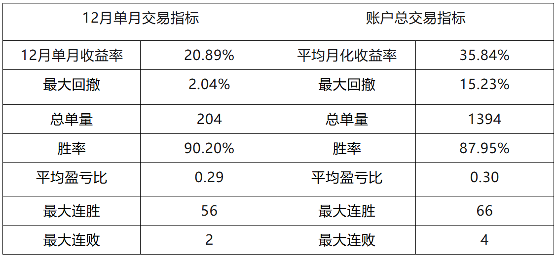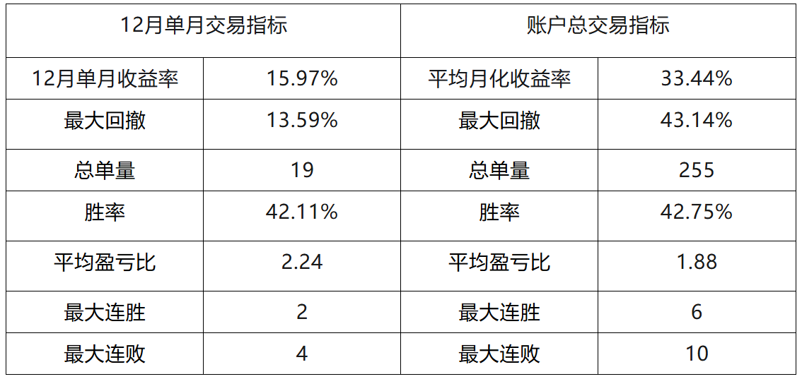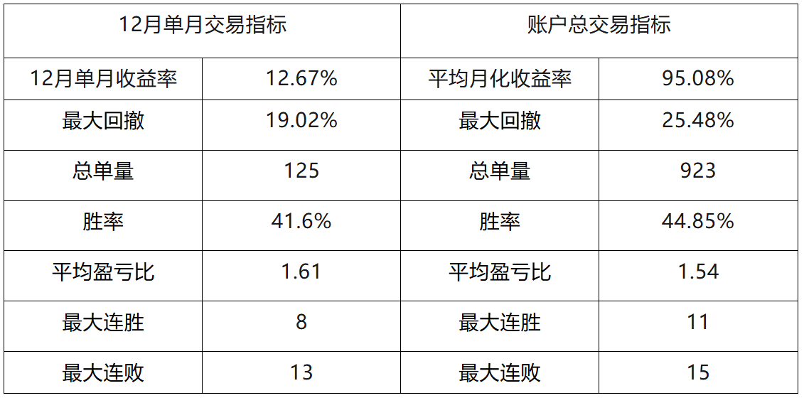 该账户仅仅采用了【长期趋势用法】,没有打开【经典用法、均线确认用法、 均线回踩用法】。所以在单量上可以看到相比于以上两个账户非常少。而且这个账户是典型的【低胜率、高盈亏比】交易策略和手法。在这样的情况下,12月份最大回撤控制在15%以内,同时月收益率也达到了13.59%。
